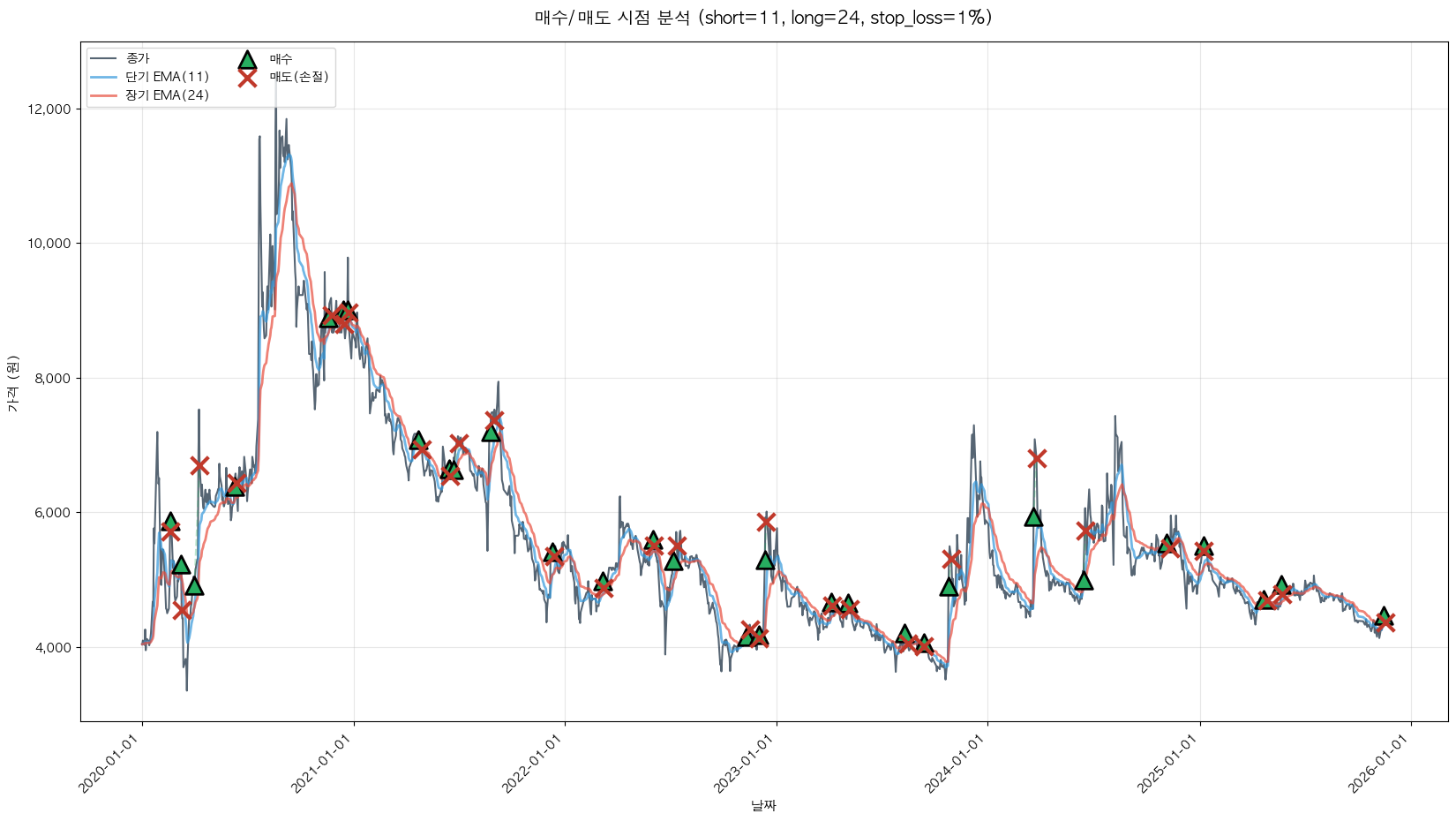 백테스팅 중... (short=11, long=24, stop_loss=1%)