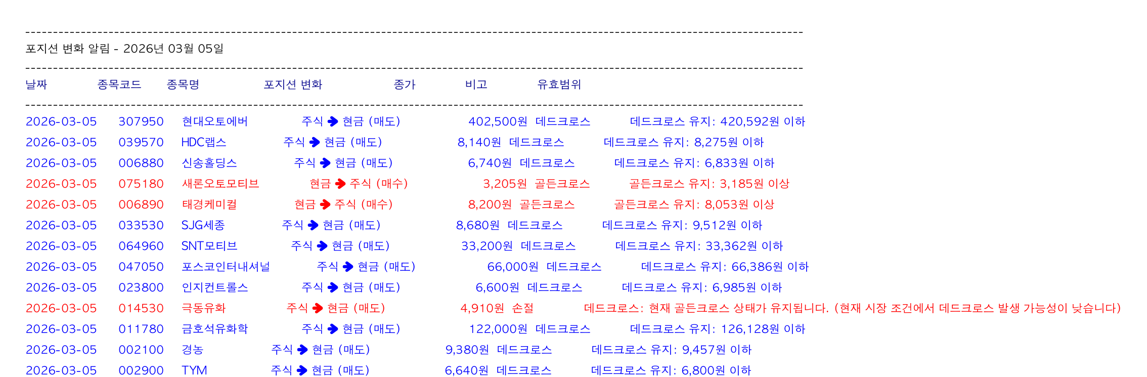 - 🔵 현대오토에버 (307950): 주식 ➜ 현금 (매도) 402,500원 데드크로스 데드크로스 유지: @ 420,592원 (이하)