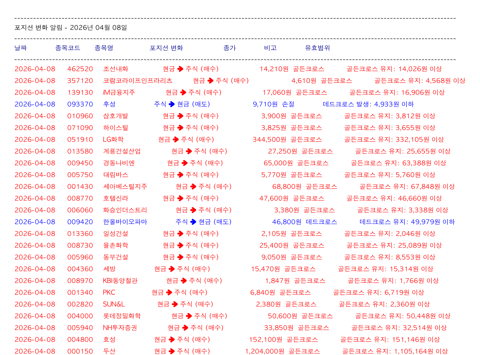 - 🔴 호텔신라 (008770): 현금 ➜ 주식 (매수) 47,600원 골든크로스 골든크로스 유지: @ 46,660원 (이상)