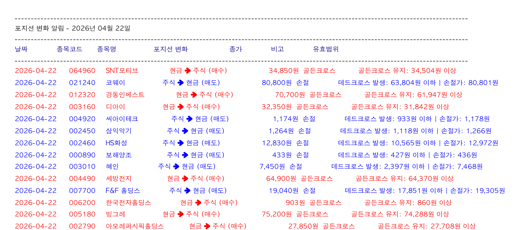 🔵 코웨이 (021240): 주식 ➜ 현금 (매도) 80,800원 손절 데드크로스 발생: 63,804원 이하 @ 손절가: (80,801원) - 🔴 경동인베스트 (012320): 현금 ➜ 주식 (매수) 70,700원 골든크로스 골든크로스 유지: @ 61,947원 (이상)