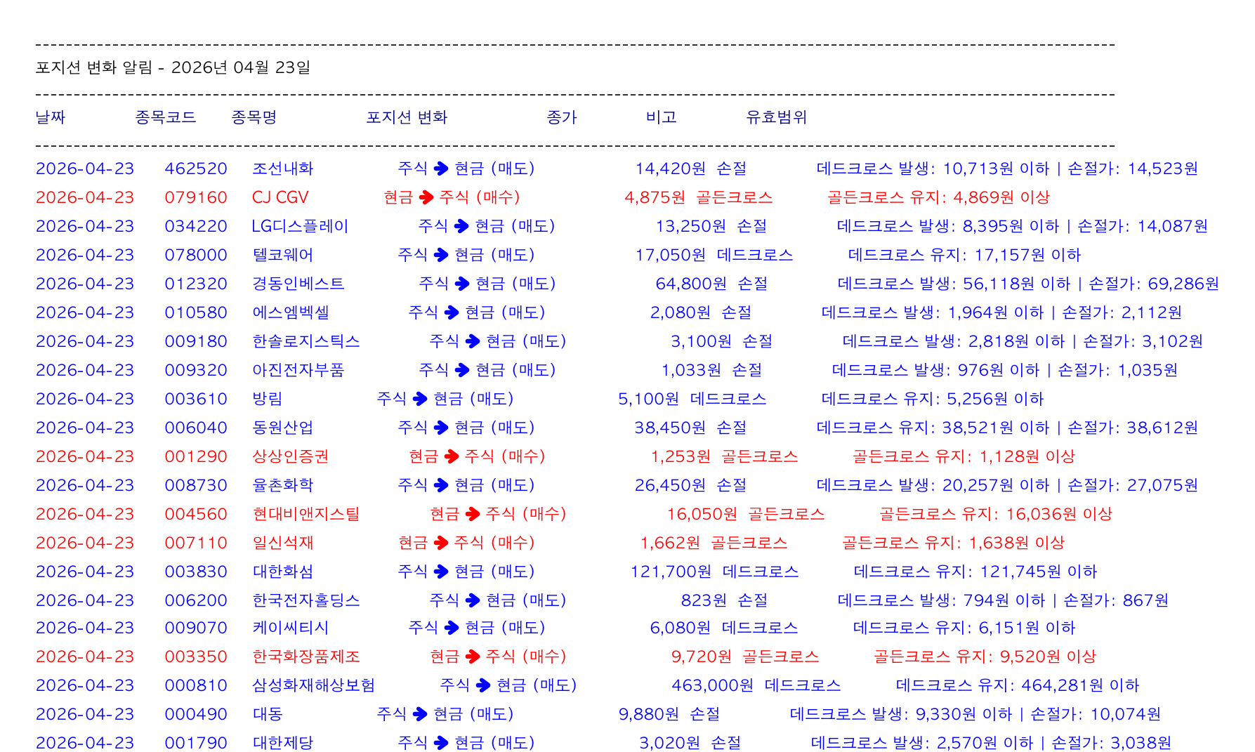 🔵 조선내화 (462520): 주식 ➜ 현금 (매도) 14,420원 손절 데드크로스 발생: 10,713원 이하 @ 손절가: (14,523원) - 🔴 CJ (079160): CGV 현금 ➜ 주식 (매수) 4,875원 골든크로스 골든크로스 유지: @ 4,869원 (이상)