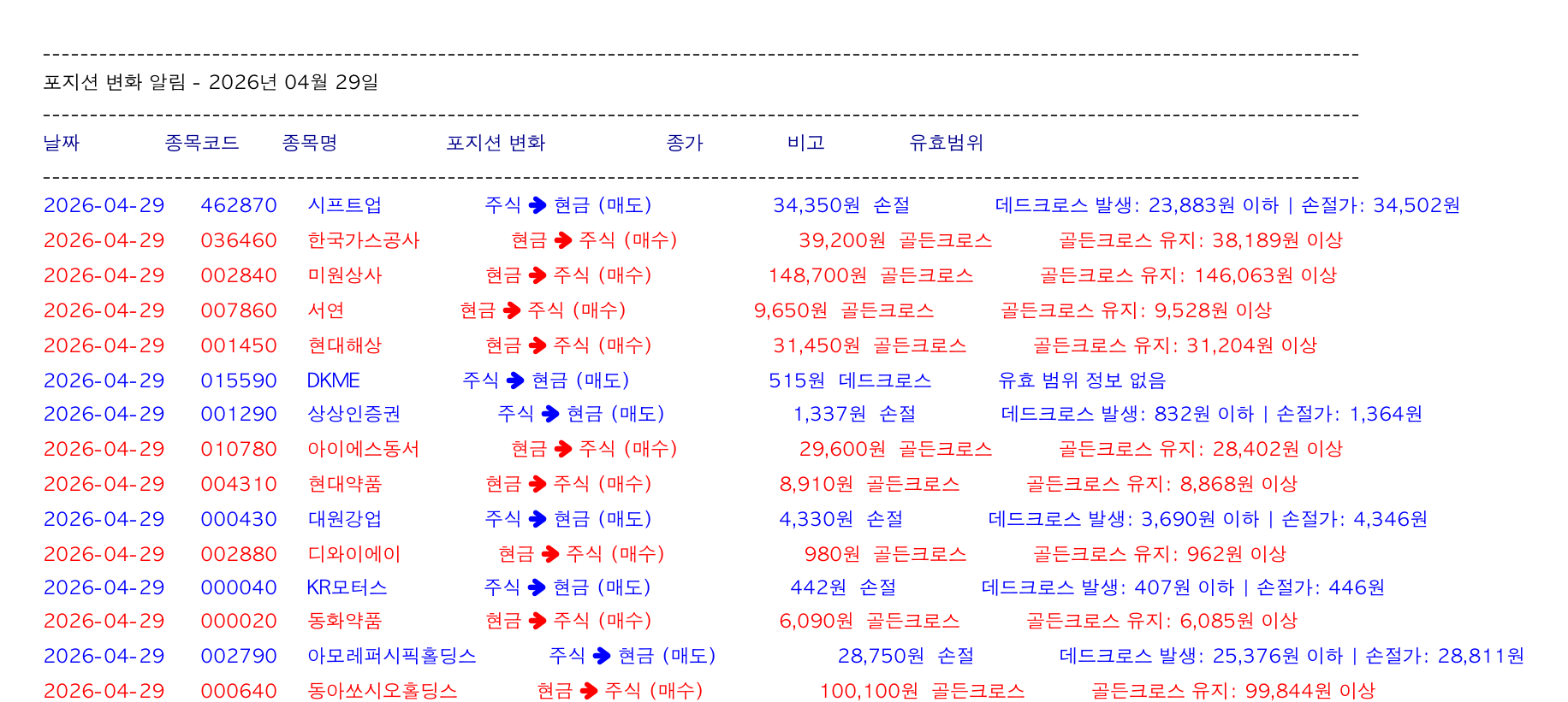 🔵 대원강업 (000430): 주식 ➜ 현금 (매도) 4,330원 손절 데드크로스 발생: 3,690원 이하 @ 손절가: (4,346원) - 🔴 디와이에이 (002880): 현금 ➜ 주식 (매수) 980원 골든크로스 골든크로스 유지: @ 962원 (이상)
