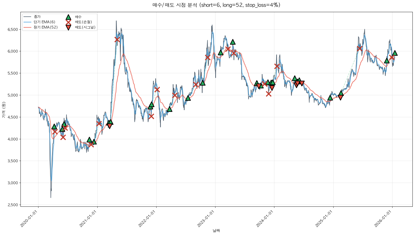 백테스팅 중... (short=6, long=52, stop_loss=4%)