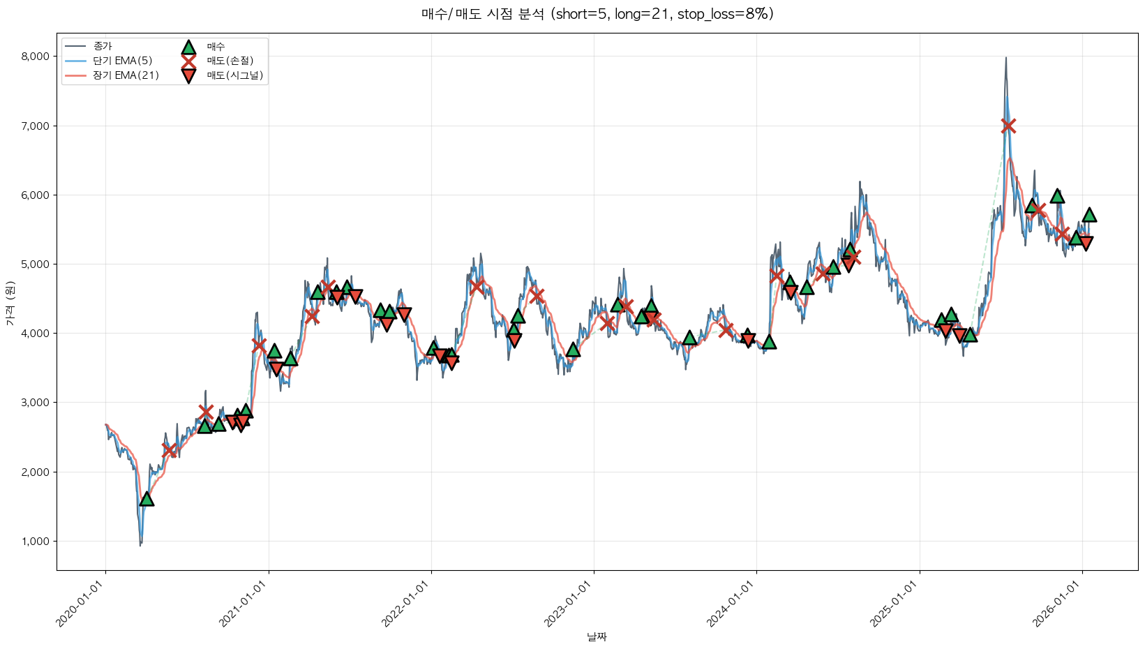 백테스팅 중... (short=5, long=21, stop_loss=8%)