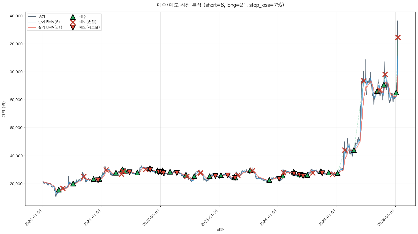 백테스팅 중... (short=8, long=21, stop_loss=7%)