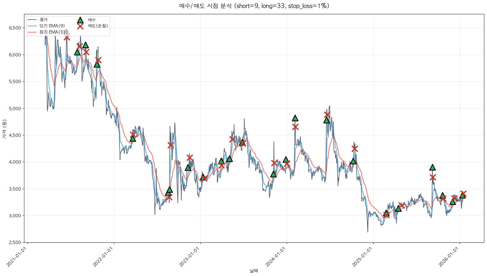 백테스팅 중... (short=9, long=33, stop_loss=1%)