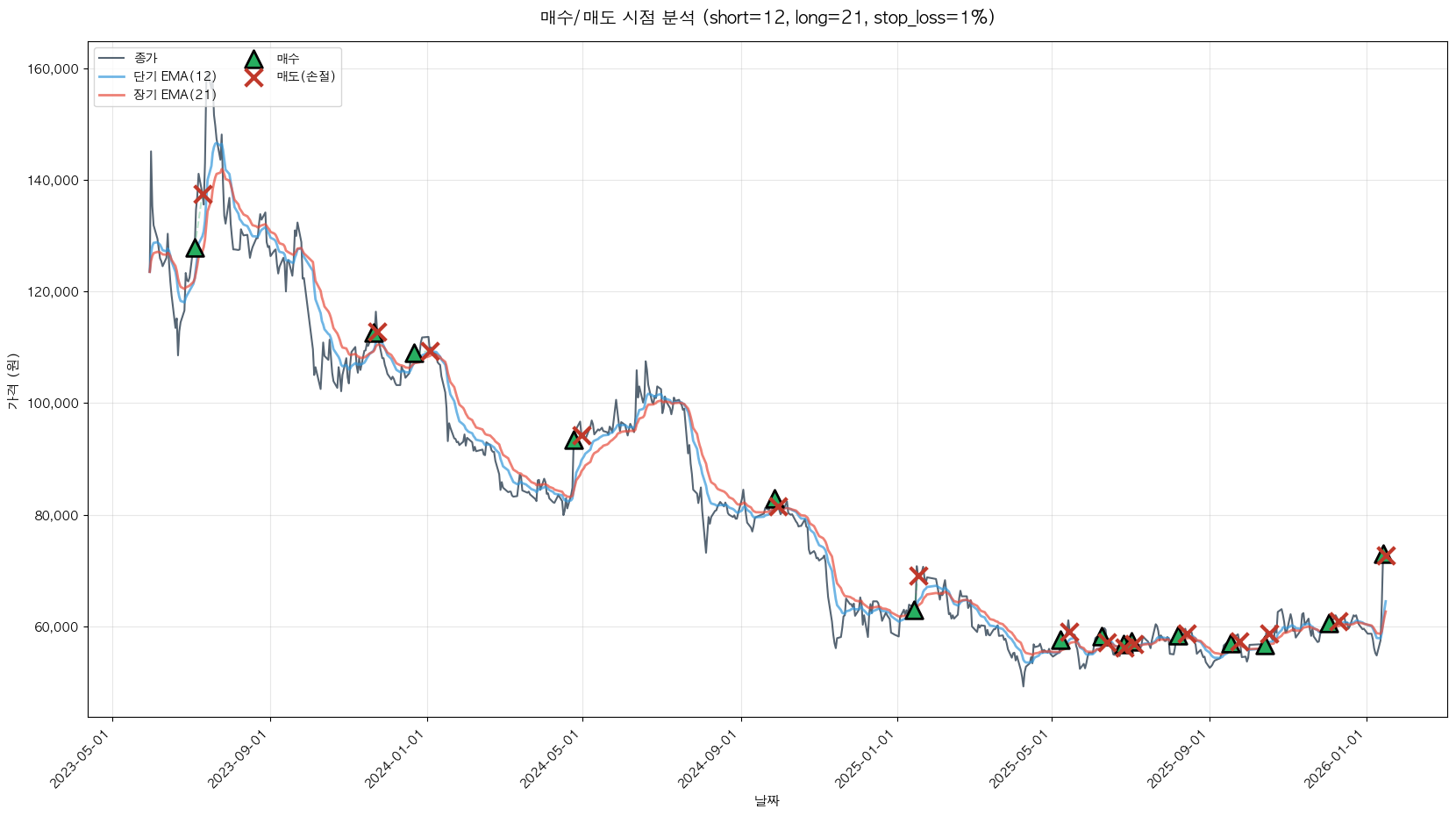백테스팅 중... (short=12, long=21, stop_loss=1%)