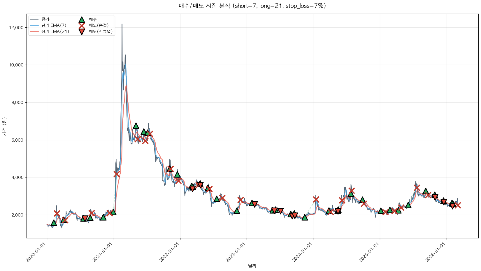 백테스팅 중... (short=7, long=21, stop_loss=7%)