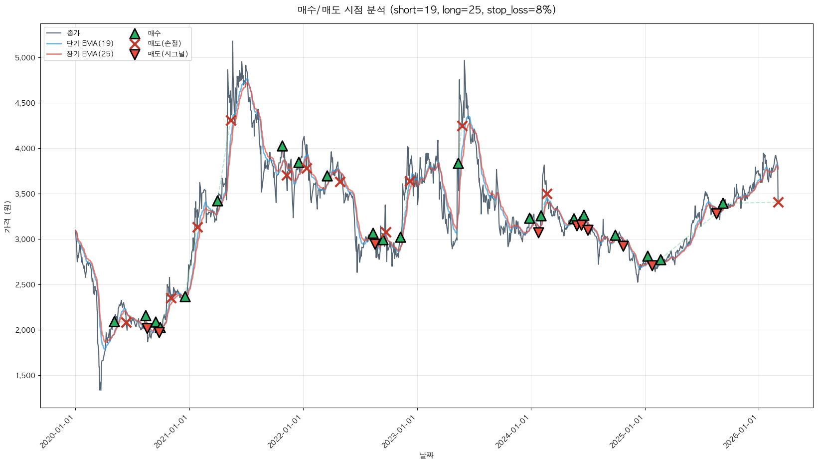 최적 파라미터: 단기=19, 장기=25, 손절=8%