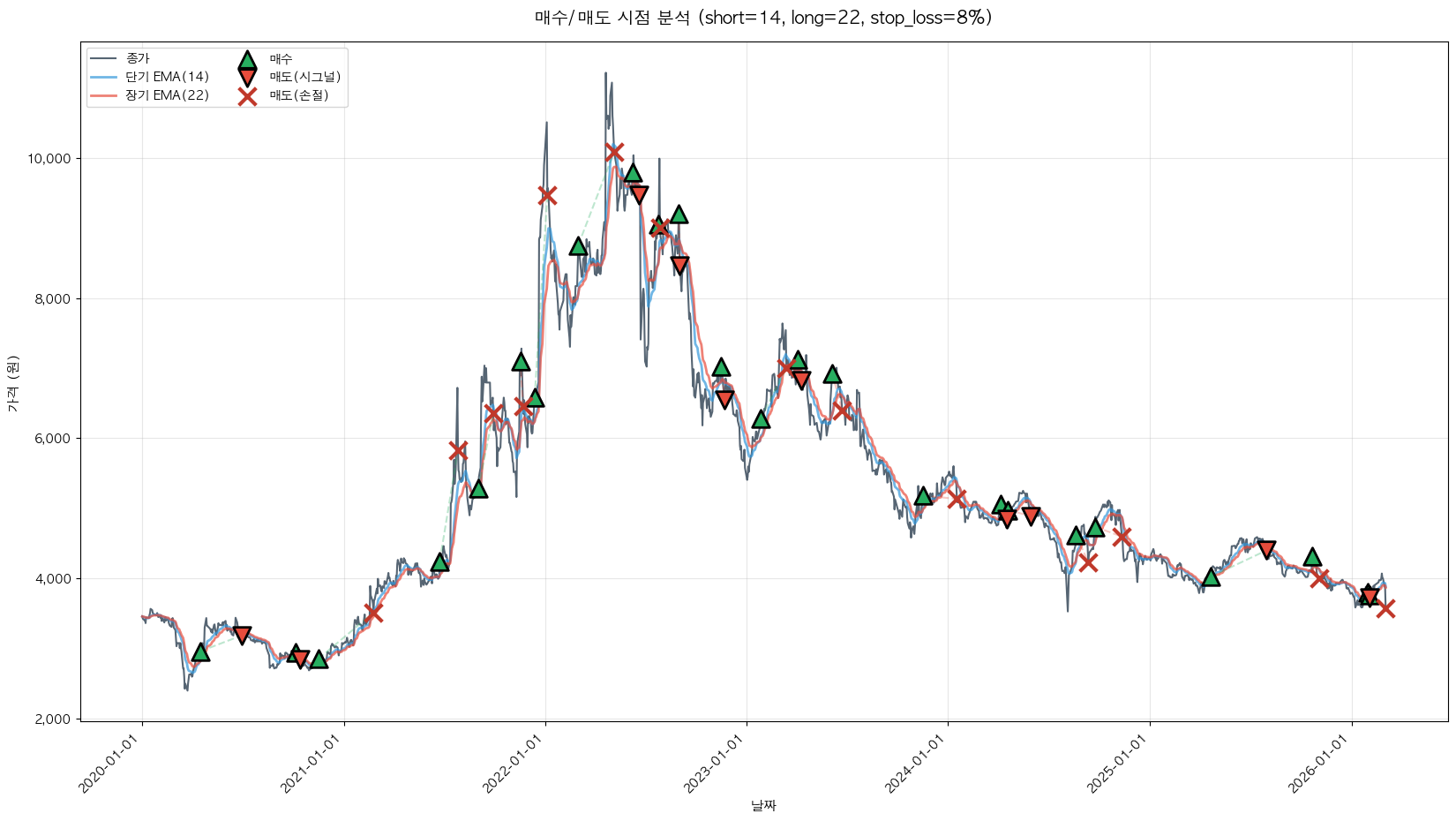 백테스팅 중... (short=14, long=22, stop_loss=8%)