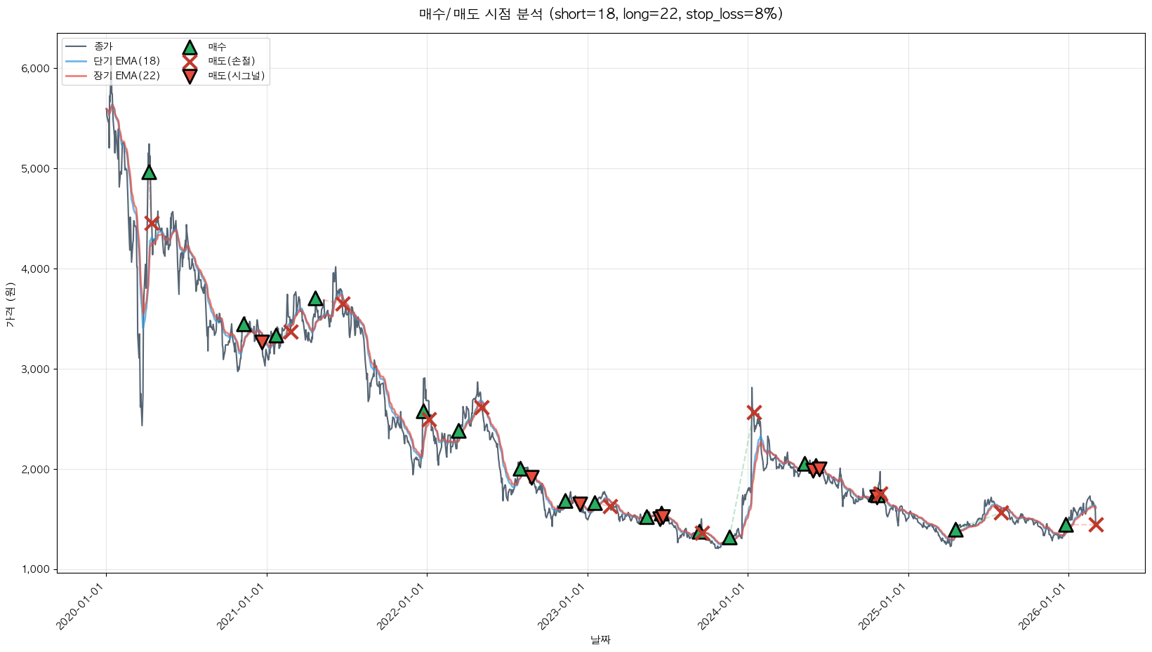 백테스팅 중... (short=18, long=22, stop_loss=8%)