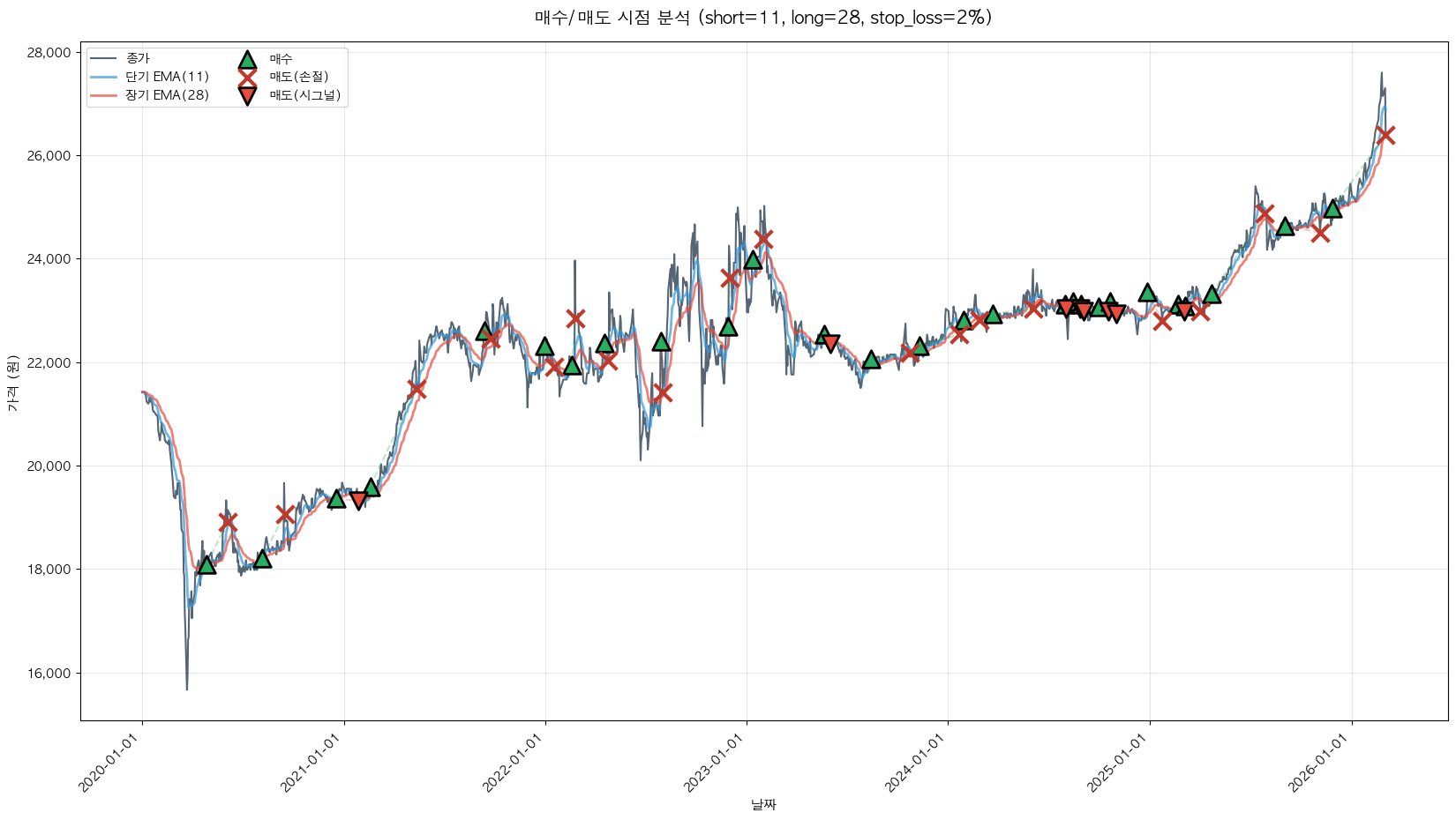 백테스팅 중... (short=11, long=28, stop_loss=2%)