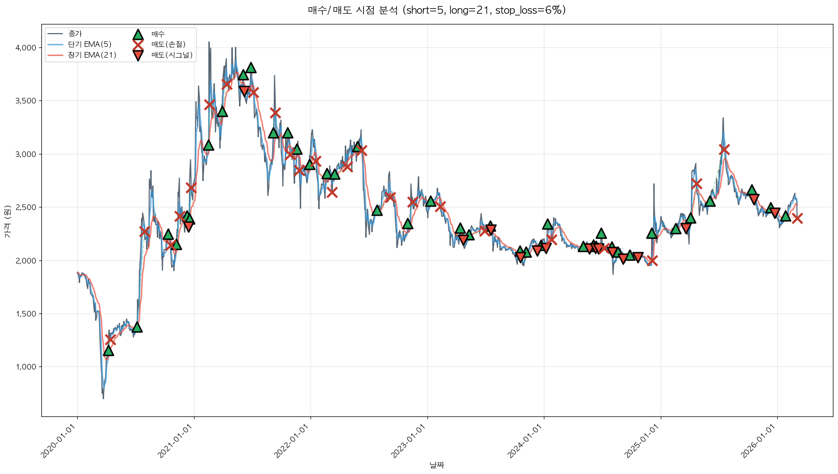 백테스팅 중... (short=5, long=21, stop_loss=6%)