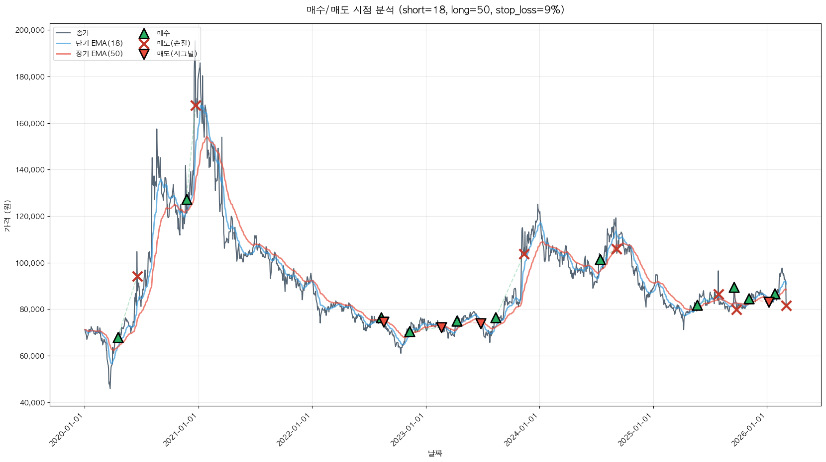 백테스팅 중... (short=18, long=50, stop_loss=9%)