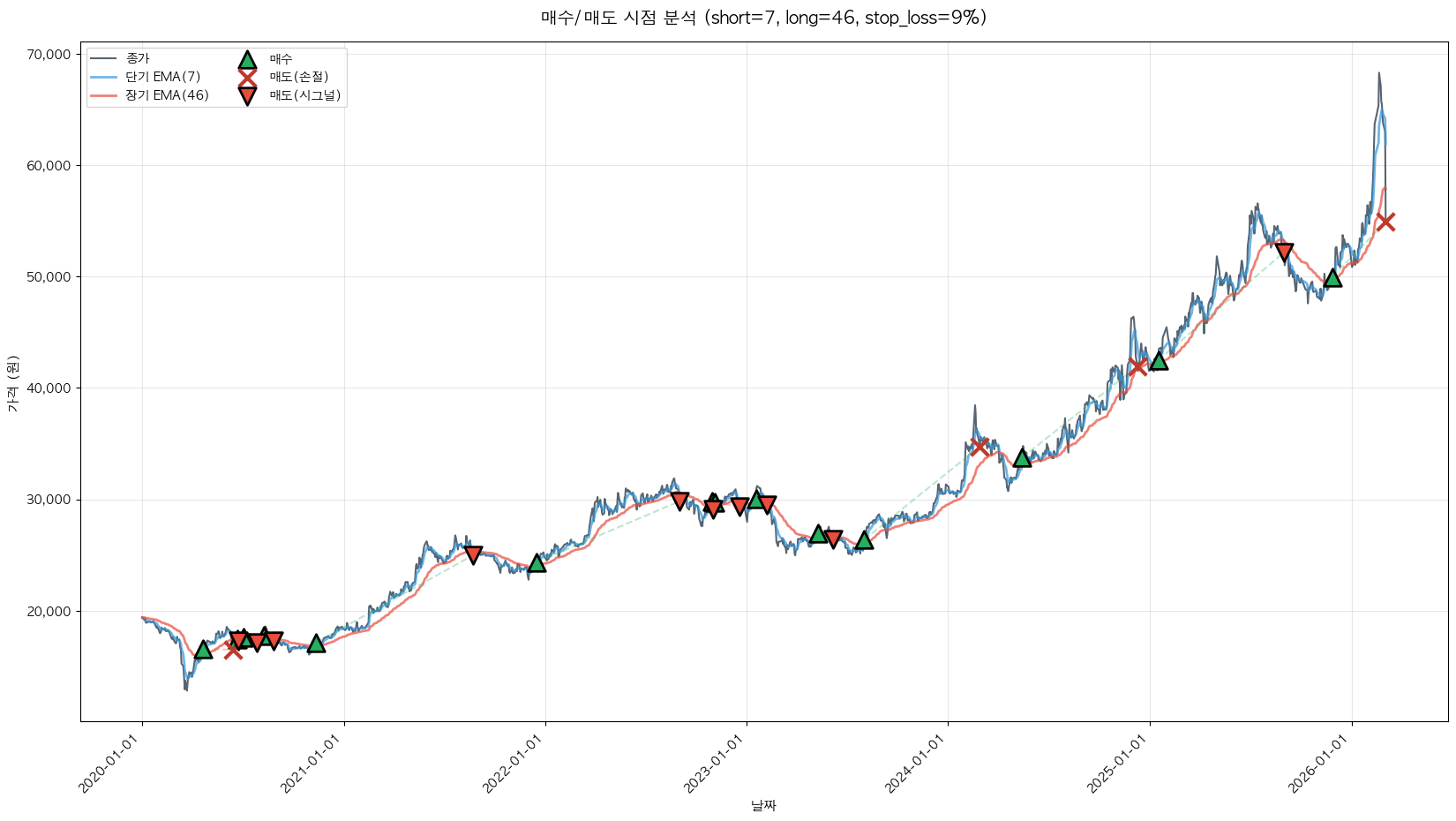 최적 파라미터: 단기=7, 장기=46, 손절=9%