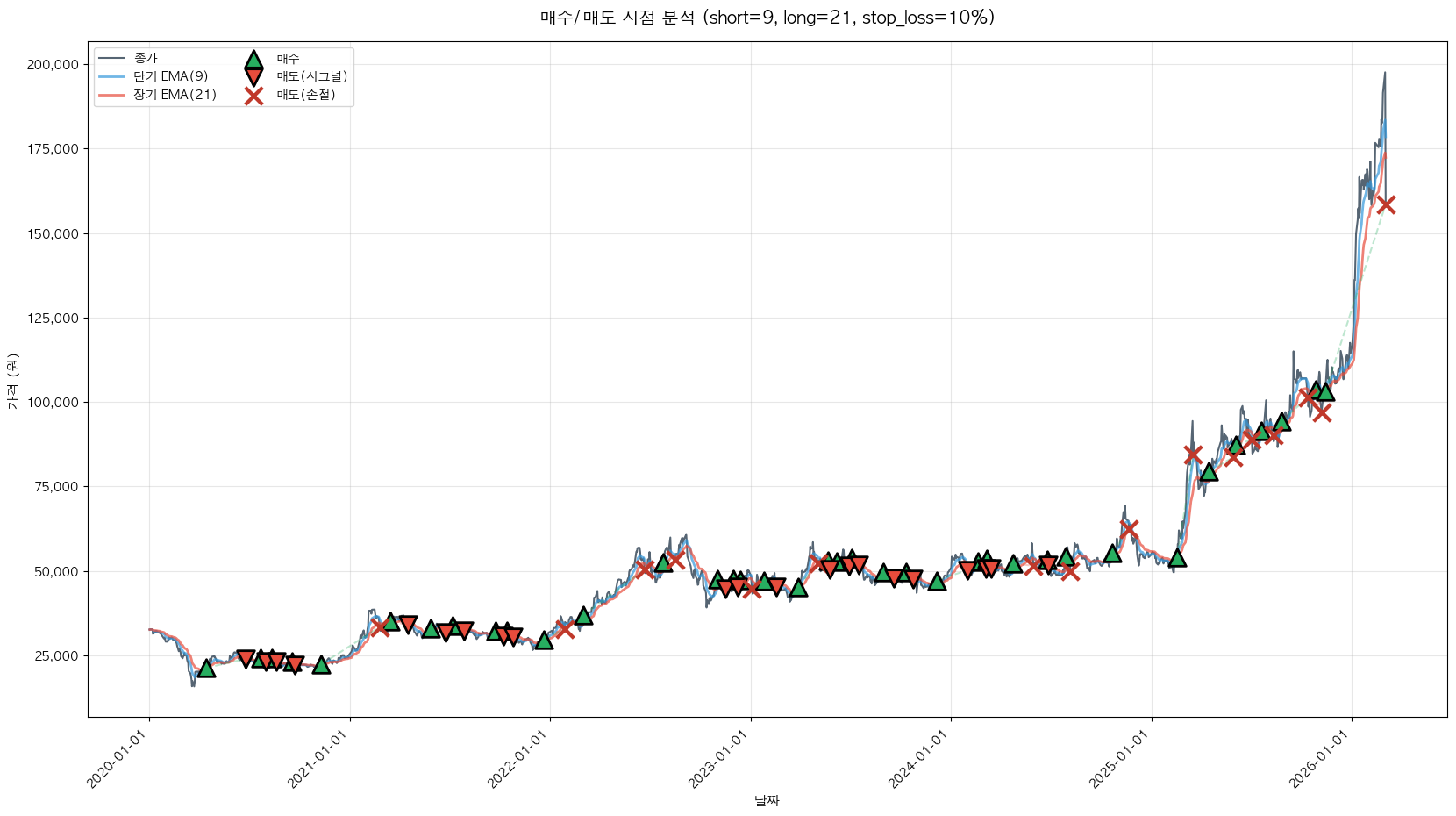 • 골든크로스: 단기 EMA가 장기 EMA를 상향 돌파할 때 매수