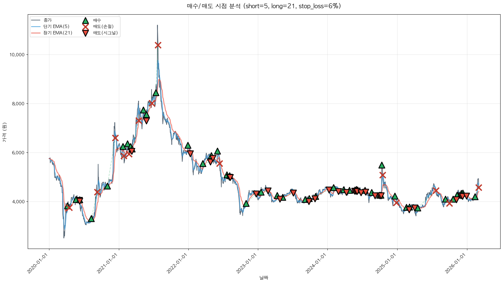 최적 파라미터: 단기=5, 장기=21, 손절=6%