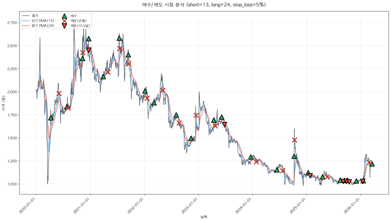 백테스팅 중... (short=13, long=24, stop_loss=5%)