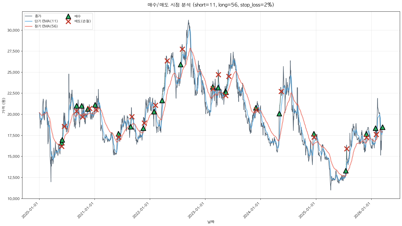 최적 파라미터: 단기=11, 장기=56, 손절=2%