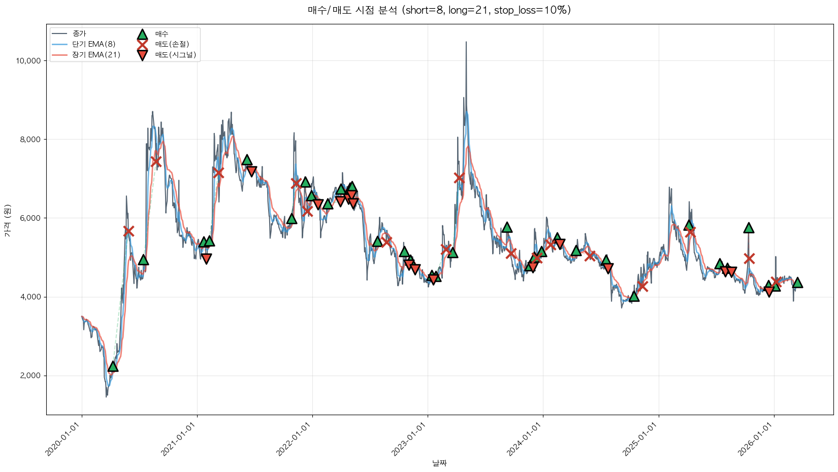 백테스팅 중... (short=8, long=21, stop_loss=10%)