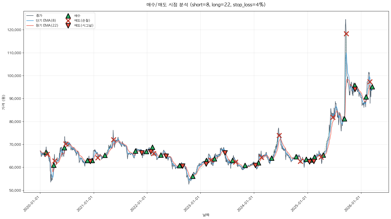 백테스팅 중... (short=8, long=22, stop_loss=4%)
