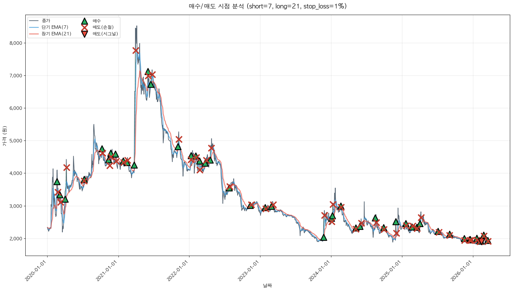 백테스팅 중... (short=7, long=21, stop_loss=1%)