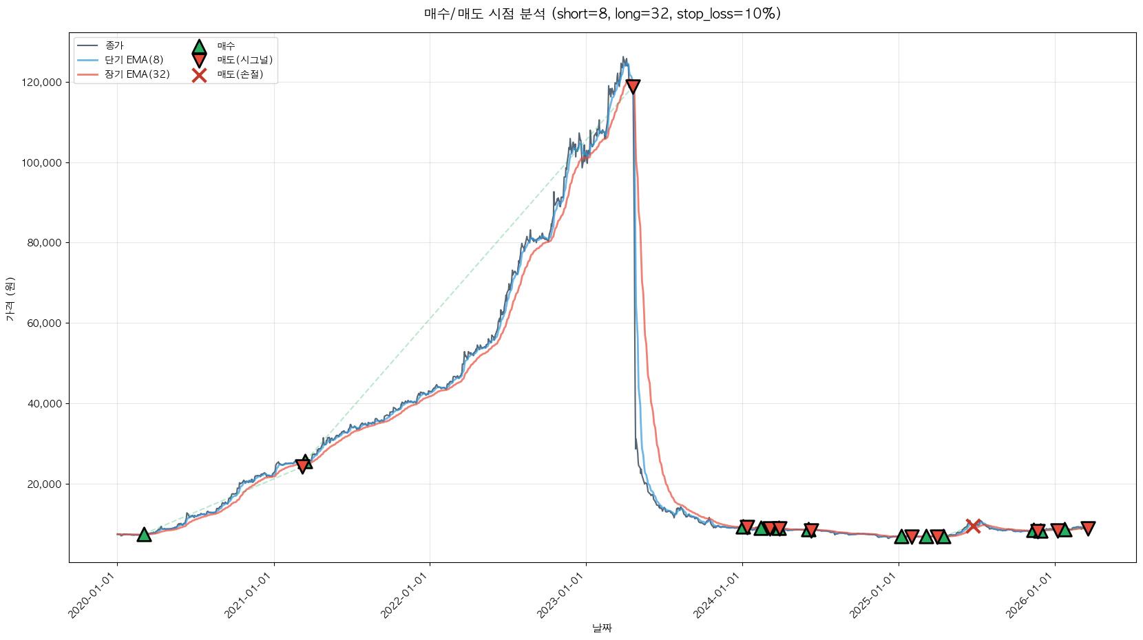 백테스팅 중... (short=8, long=32, stop_loss=10%)