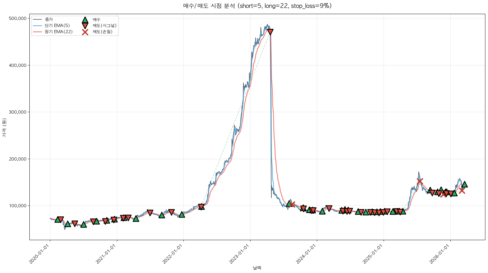 백테스팅 중... (short=5, long=22, stop_loss=9%)