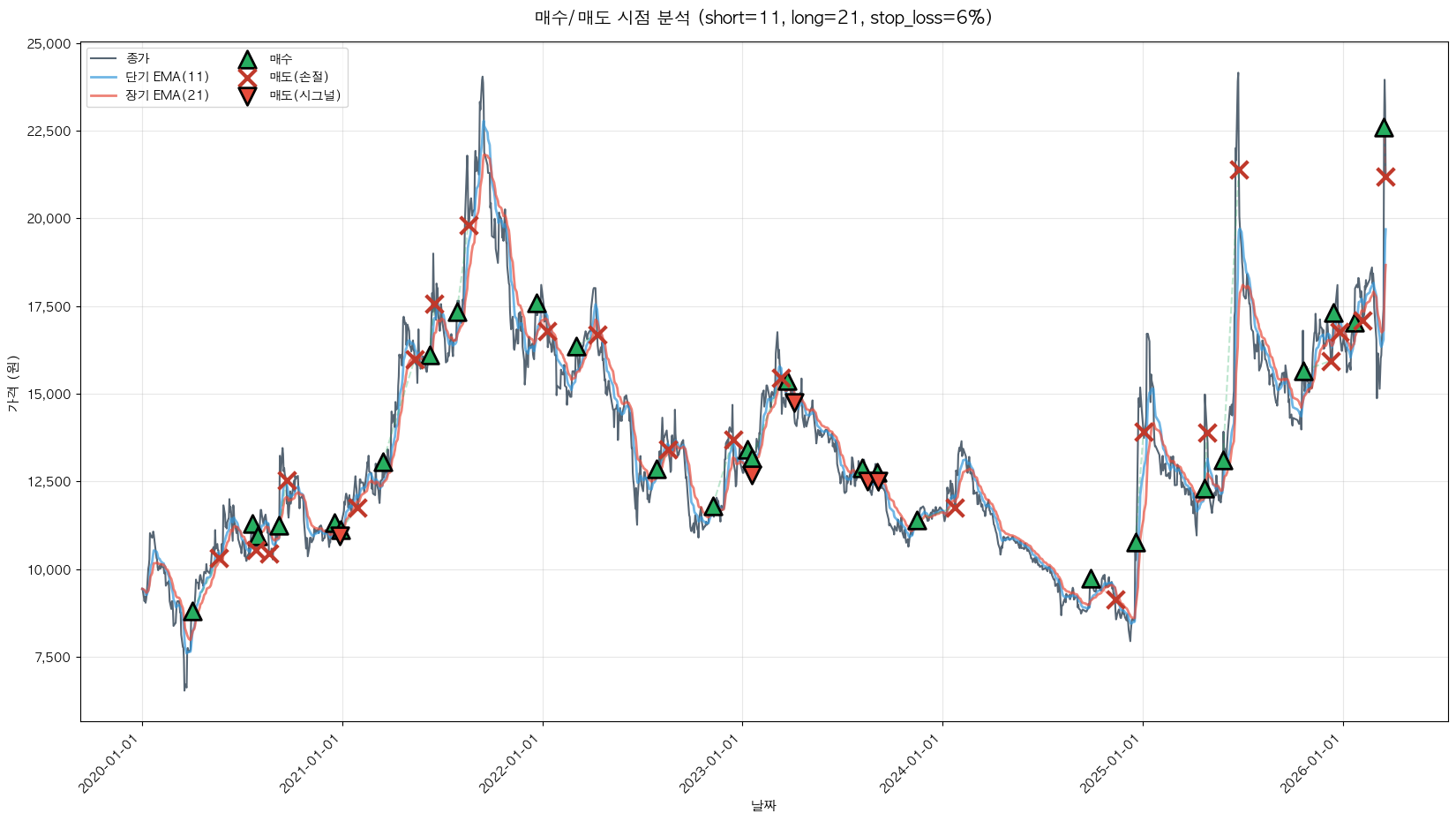 백테스팅 중... (short=11, long=21, stop_loss=6%)