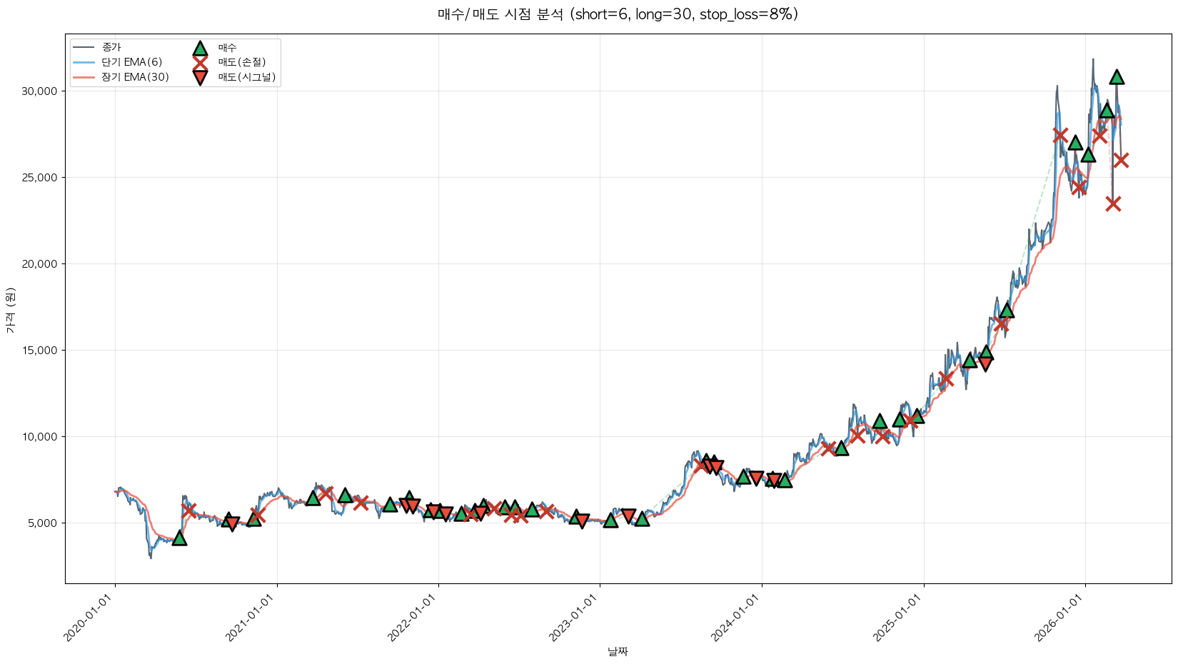 백테스팅 중... (short=6, long=30, stop_loss=8%)