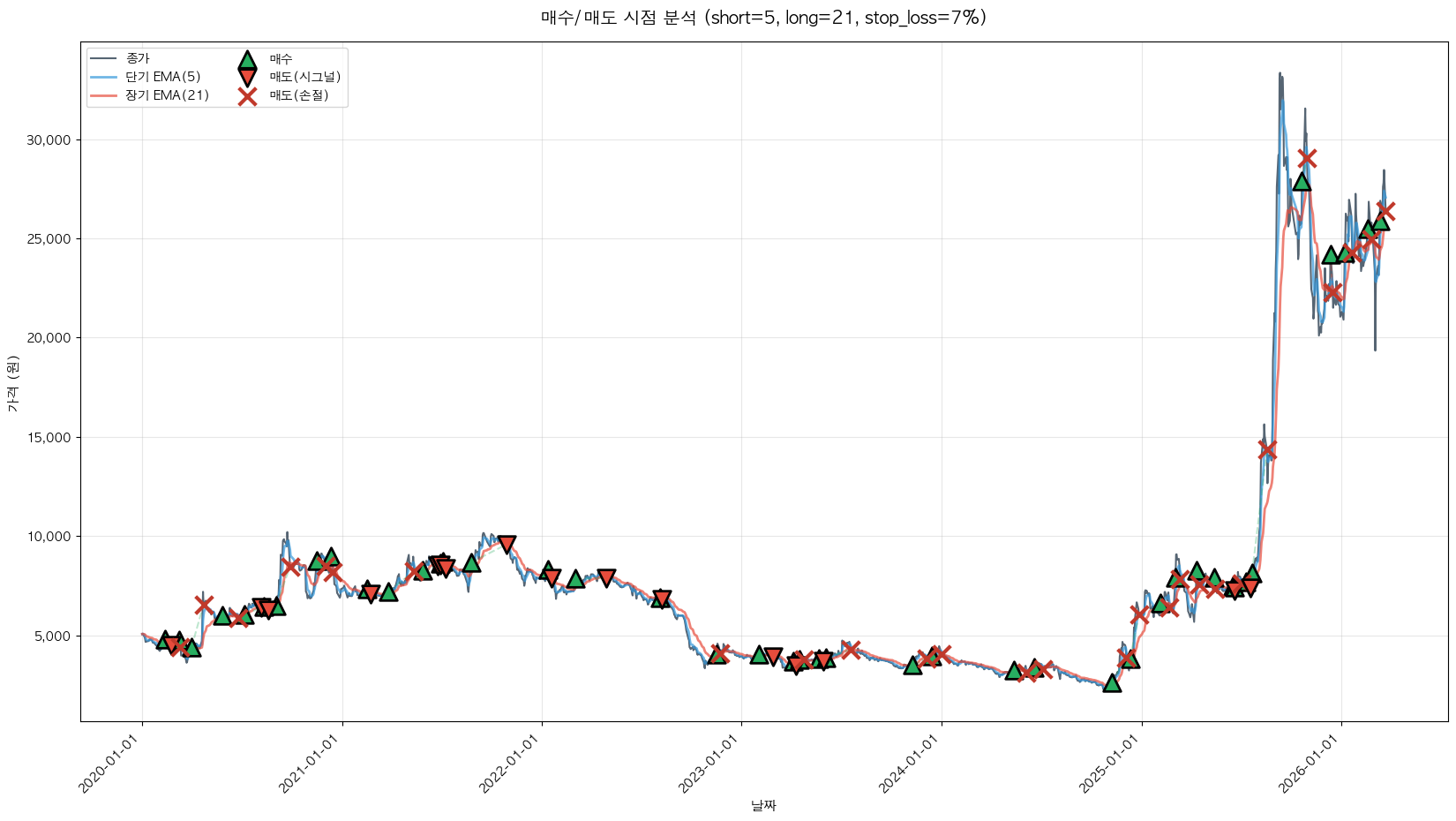 백테스팅 중... (short=5, long=21, stop_loss=7%)