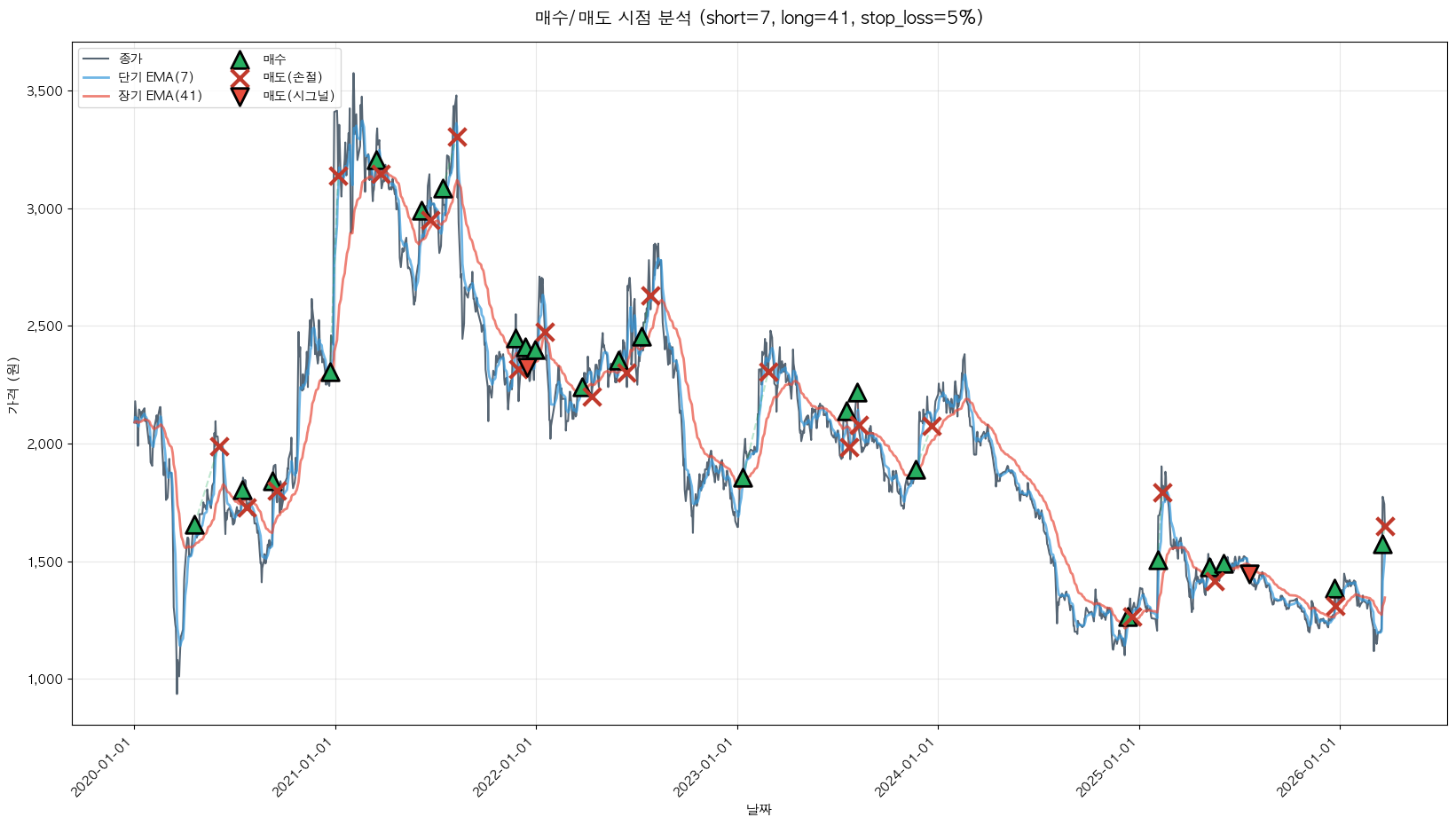 백테스팅 중... (short=7, long=41, stop_loss=5%)