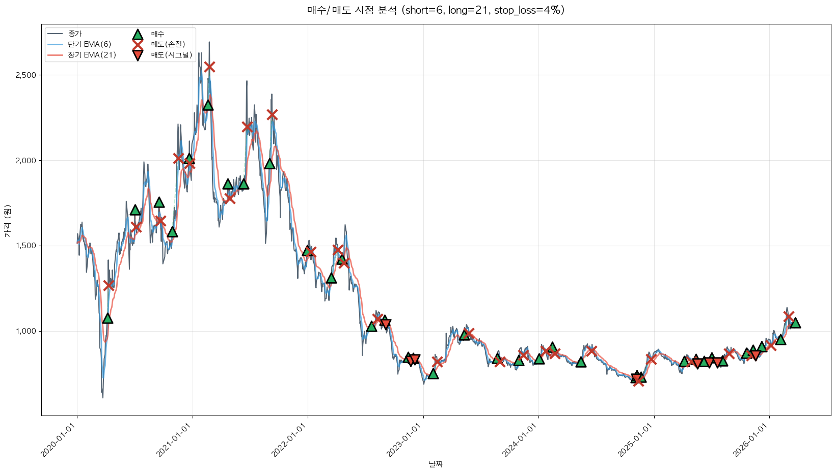 최적 파라미터: 단기=6, 장기=21, 손절=4%