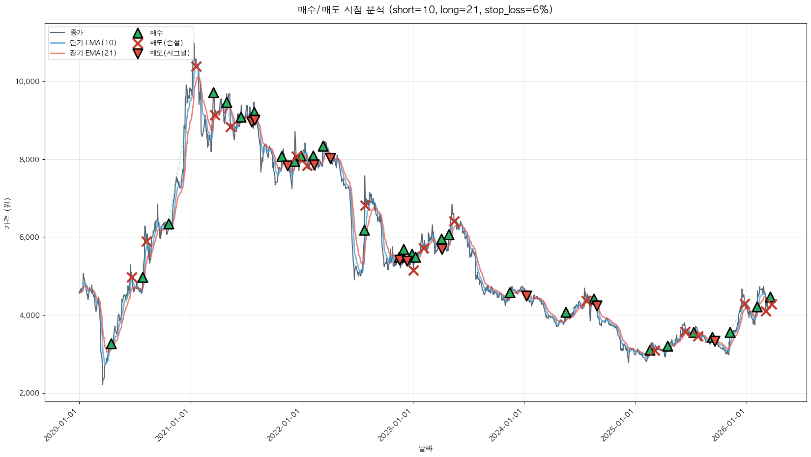 백테스팅 중... (short=10, long=21, stop_loss=6%)
