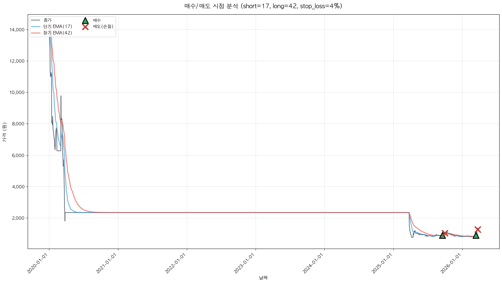 최적 파라미터: 단기=17, 장기=42, 손절=4%