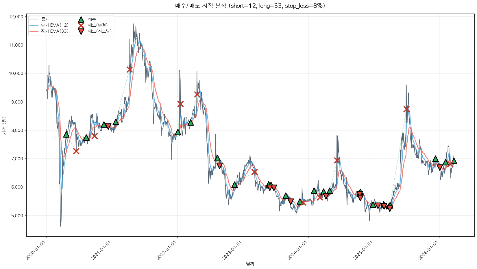 백테스팅 중... (short=12, long=33, stop_loss=8%)