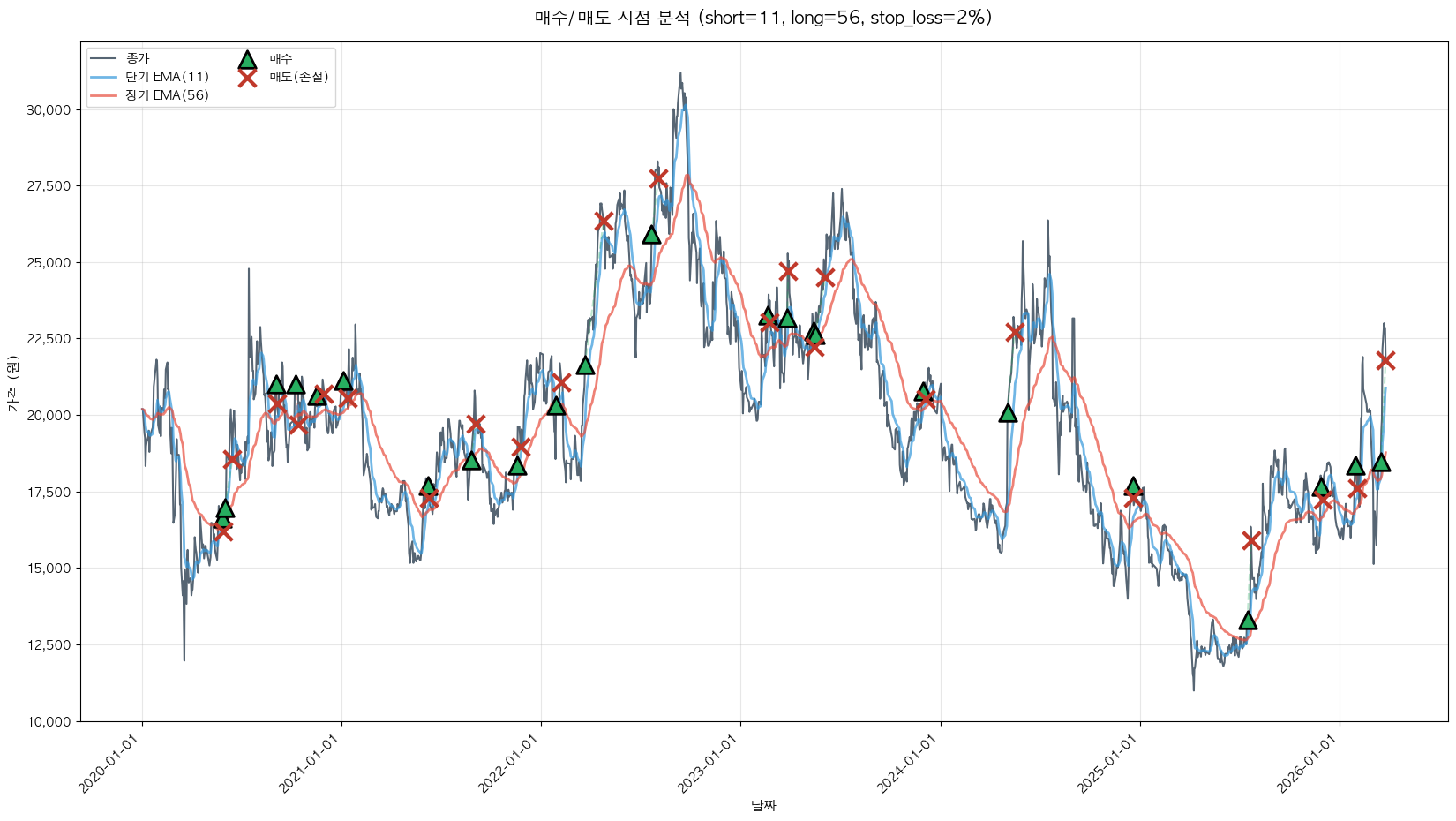 백테스팅 중... (short=11, long=56, stop_loss=2%)
