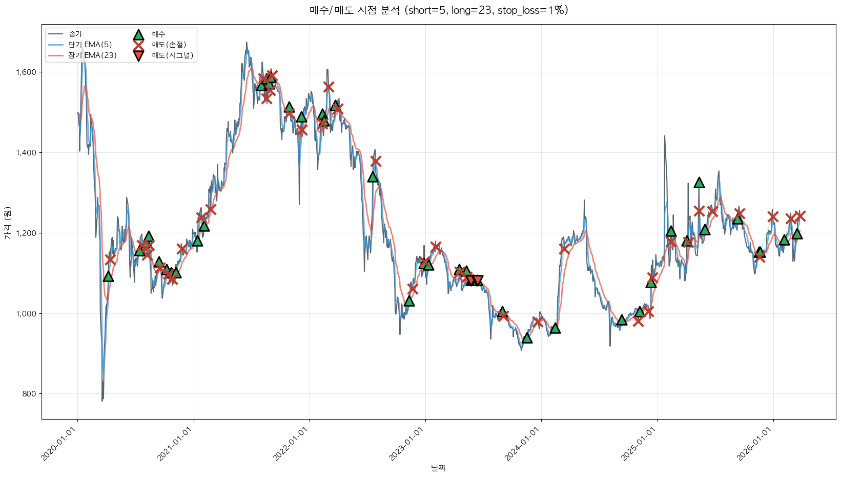 최적 파라미터: 단기=5, 장기=23, 손절=1%