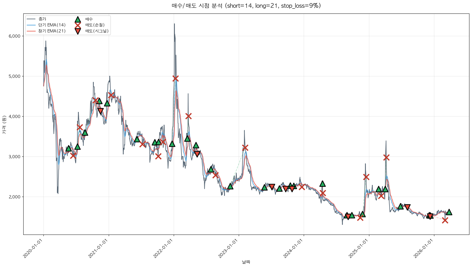 백테스팅 중... (short=14, long=21, stop_loss=9%)