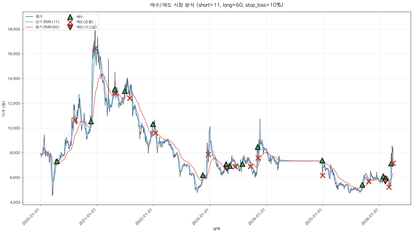백테스팅 중... (short=11, long=60, stop_loss=10%)