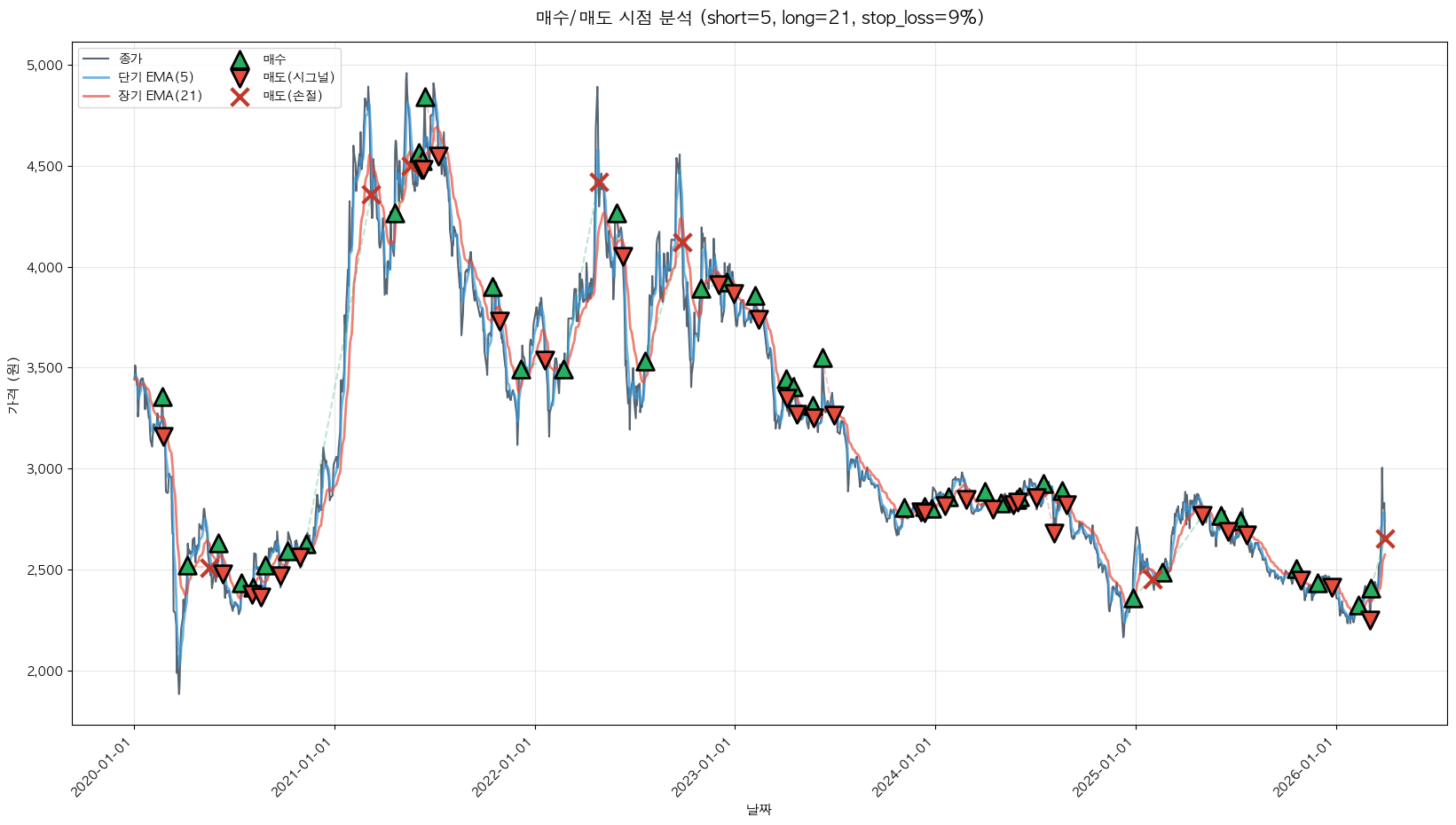 백테스팅 중... (short=5, long=21, stop_loss=9%)