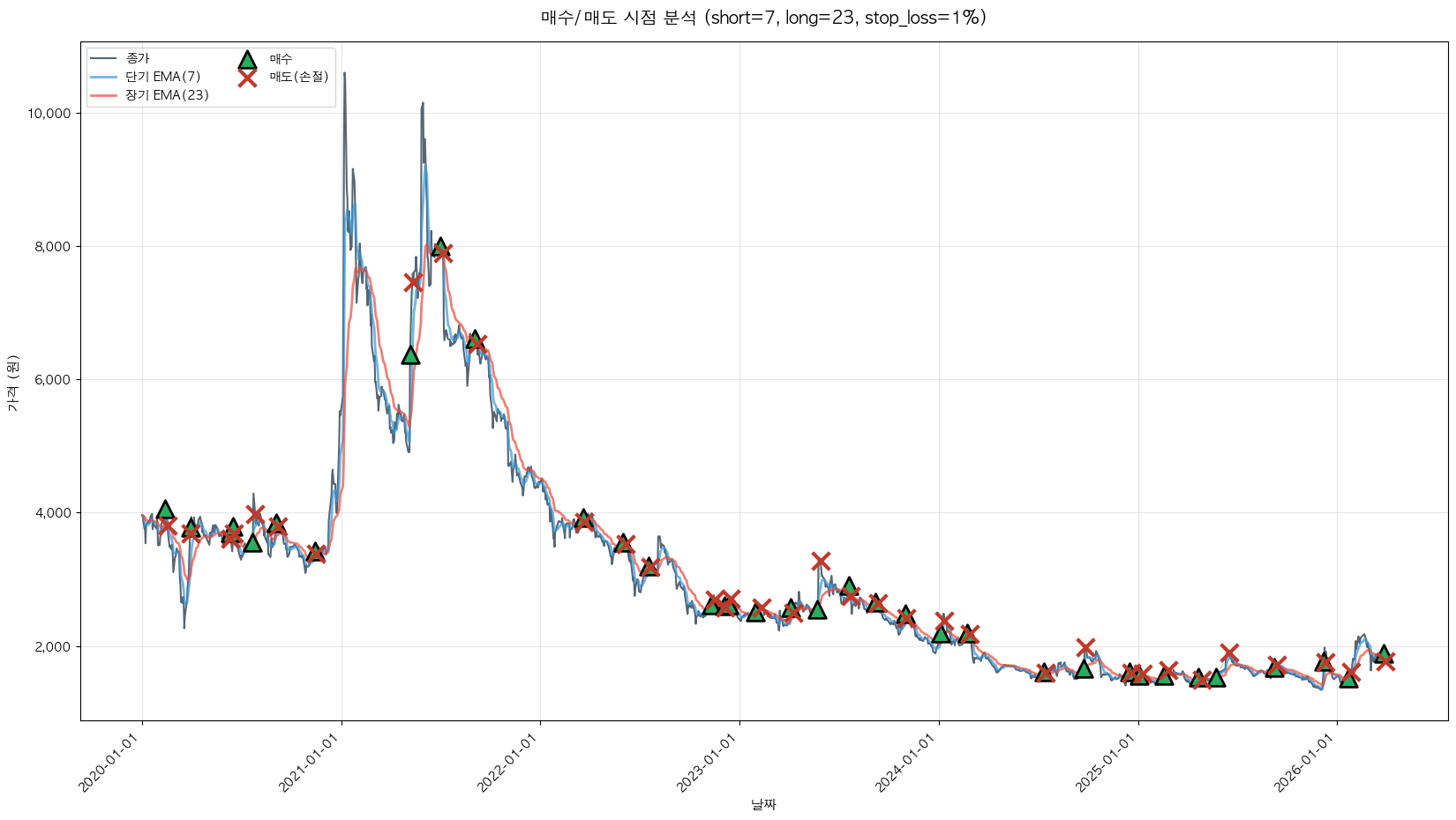 백테스팅 중... (short=7, long=23, stop_loss=1%)