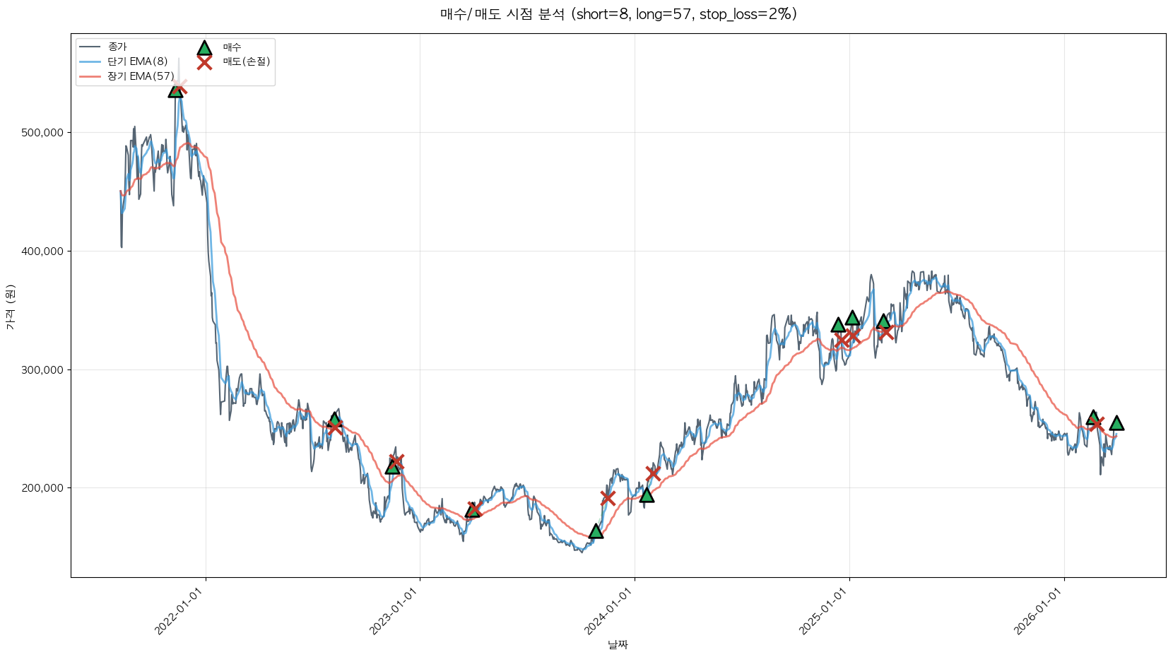 백테스팅 중... (short=8, long=57, stop_loss=2%)