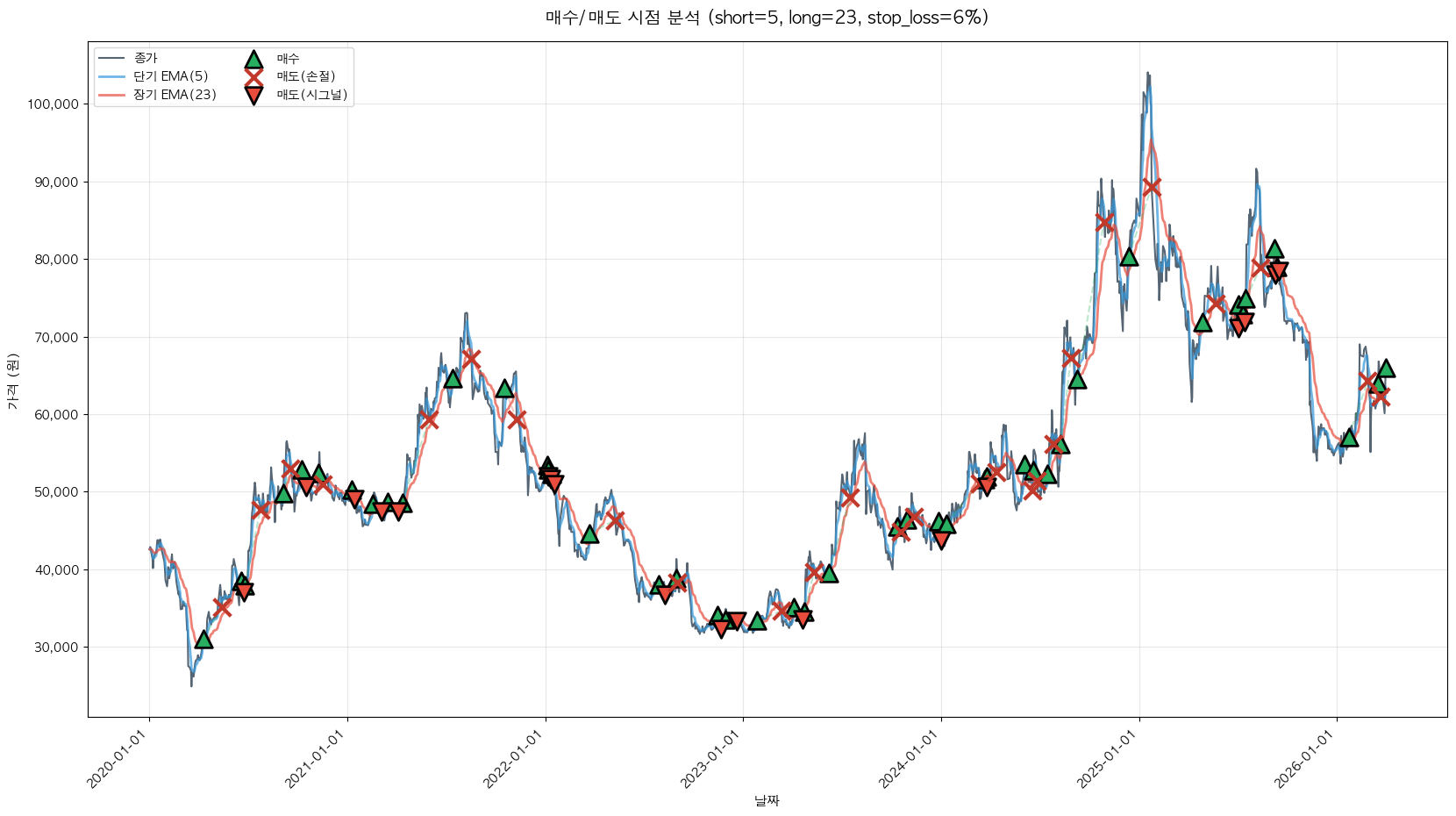 최적 파라미터: 단기=5, 장기=23, 손절=6%