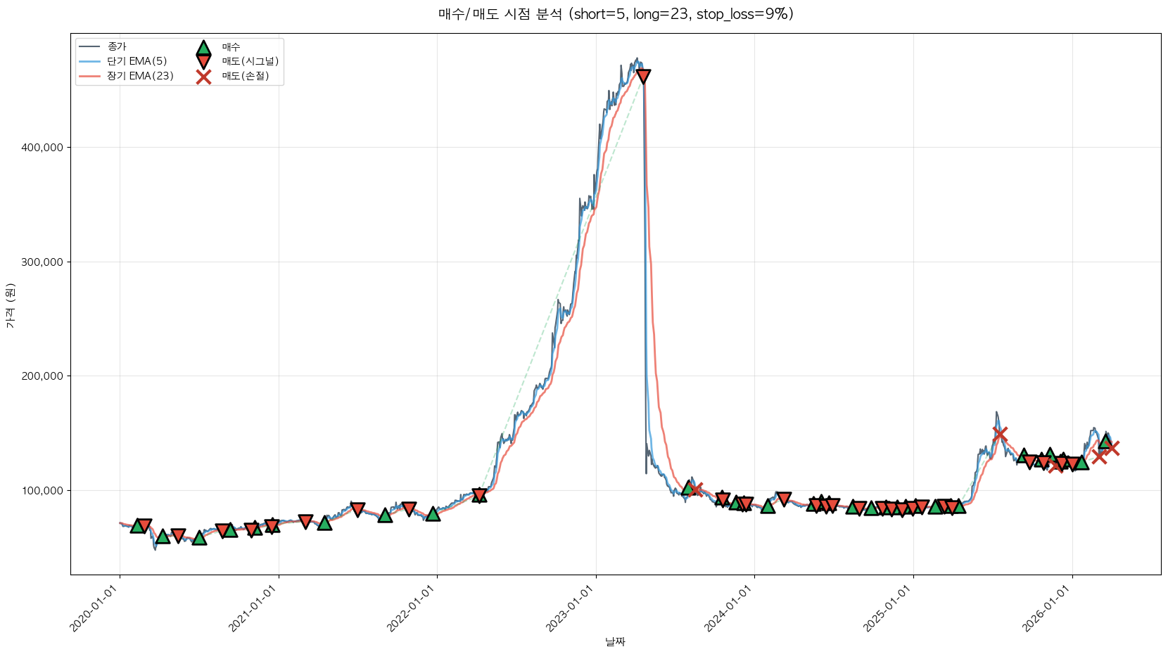 백테스팅 중... (short=5, long=23, stop_loss=9%)
