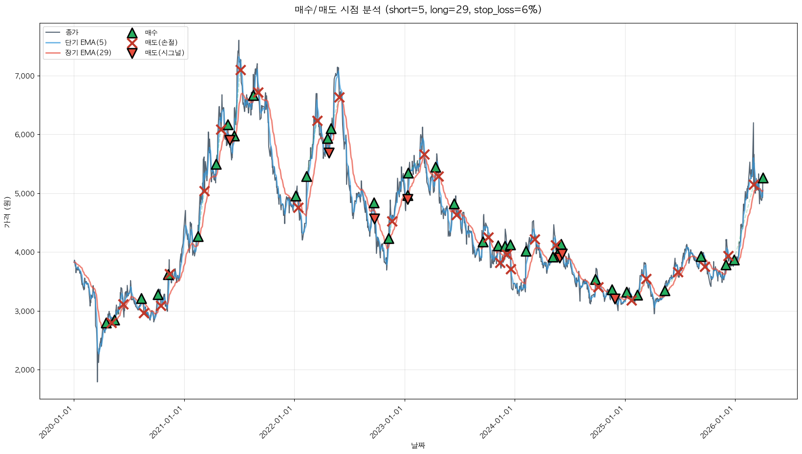 최적 파라미터: 단기=5, 장기=29, 손절=6%