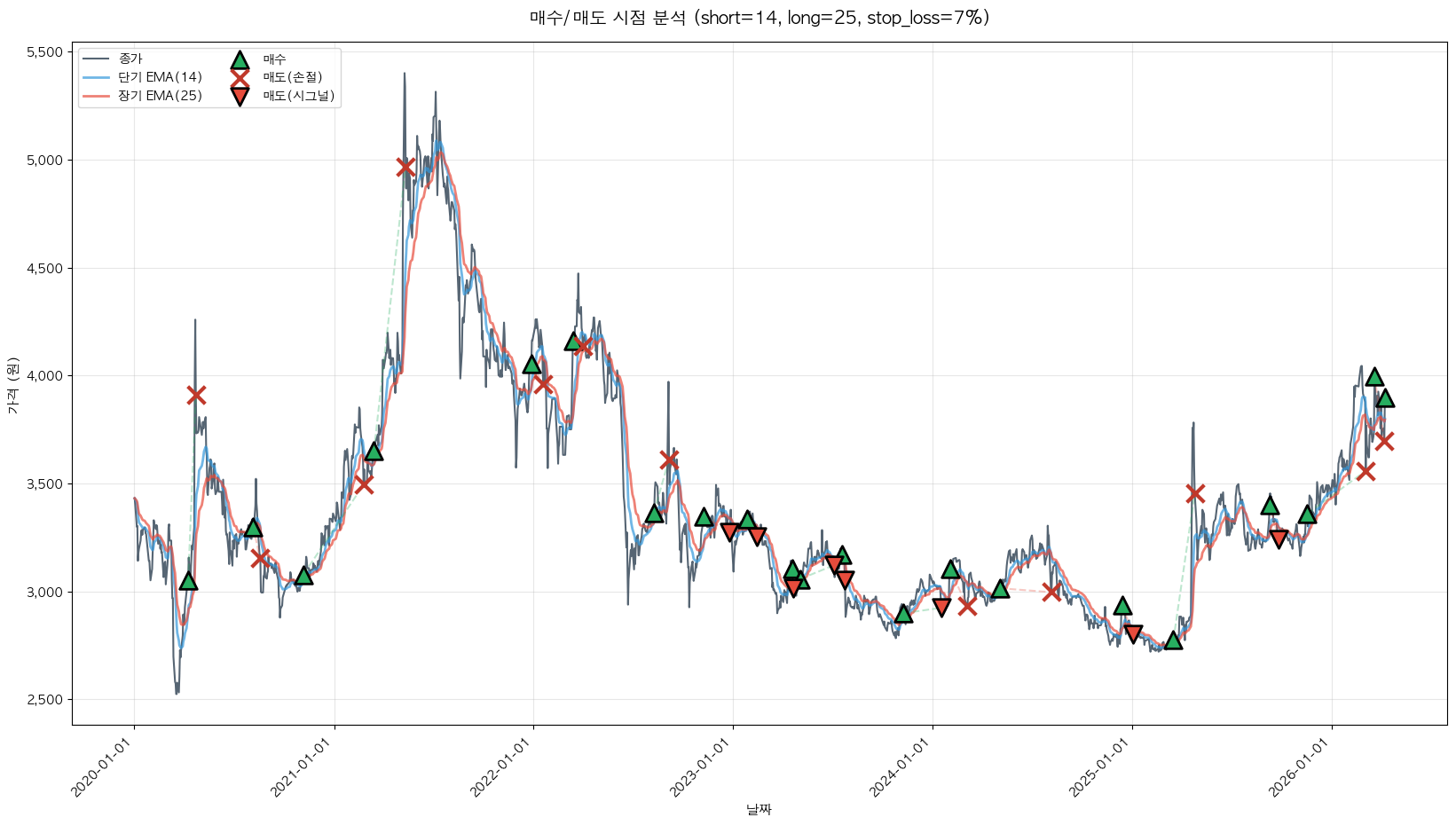 백테스팅 중... (short=14, long=25, stop_loss=7%)