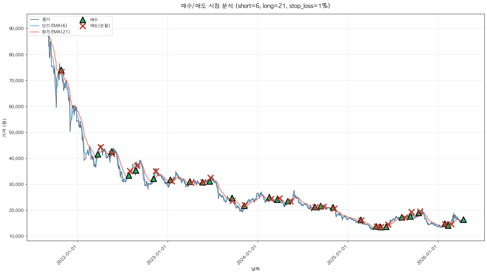 백테스팅 중... (short=6, long=21, stop_loss=1%)