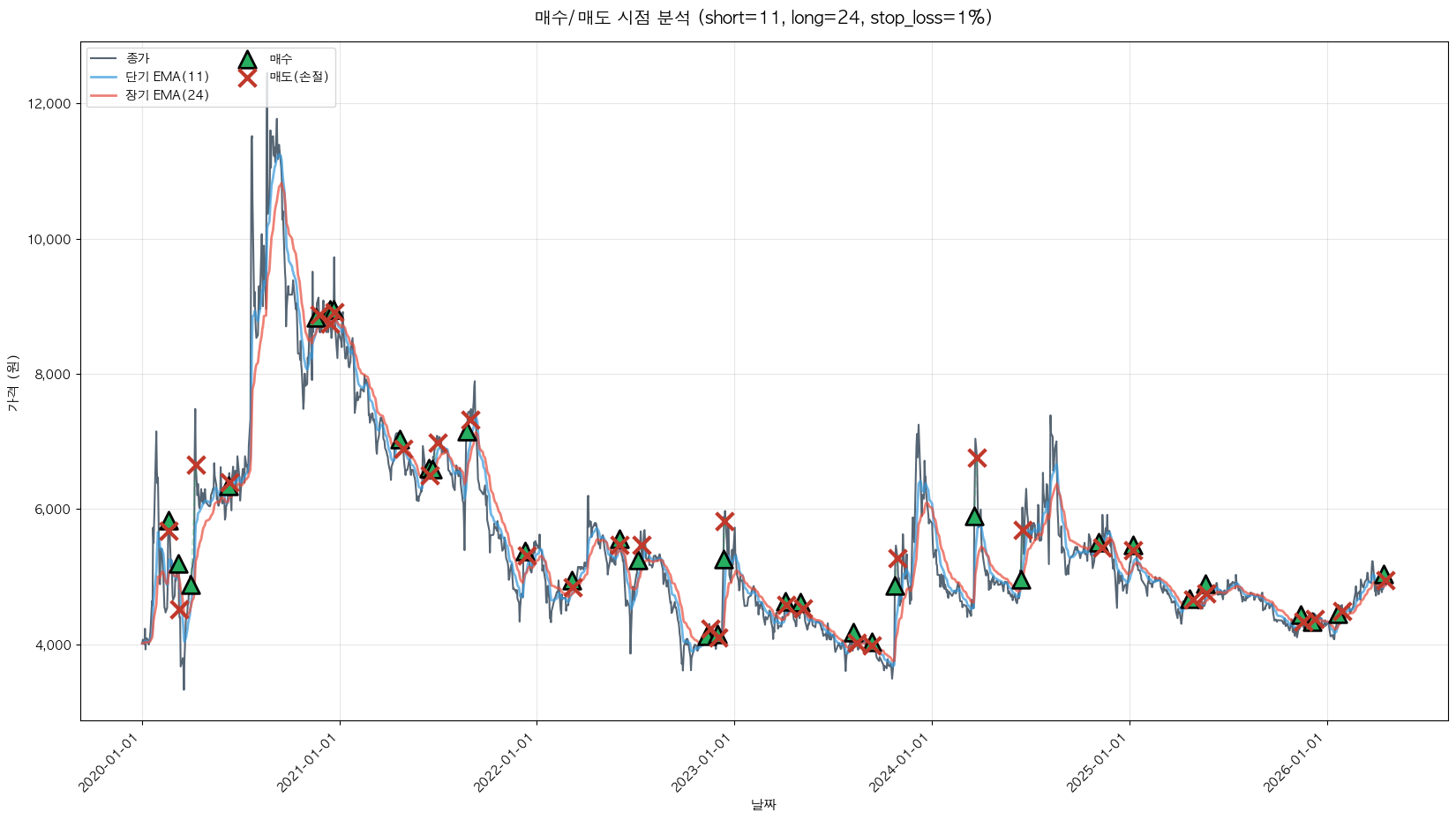 백테스팅 중... (short=11, long=24, stop_loss=1%)