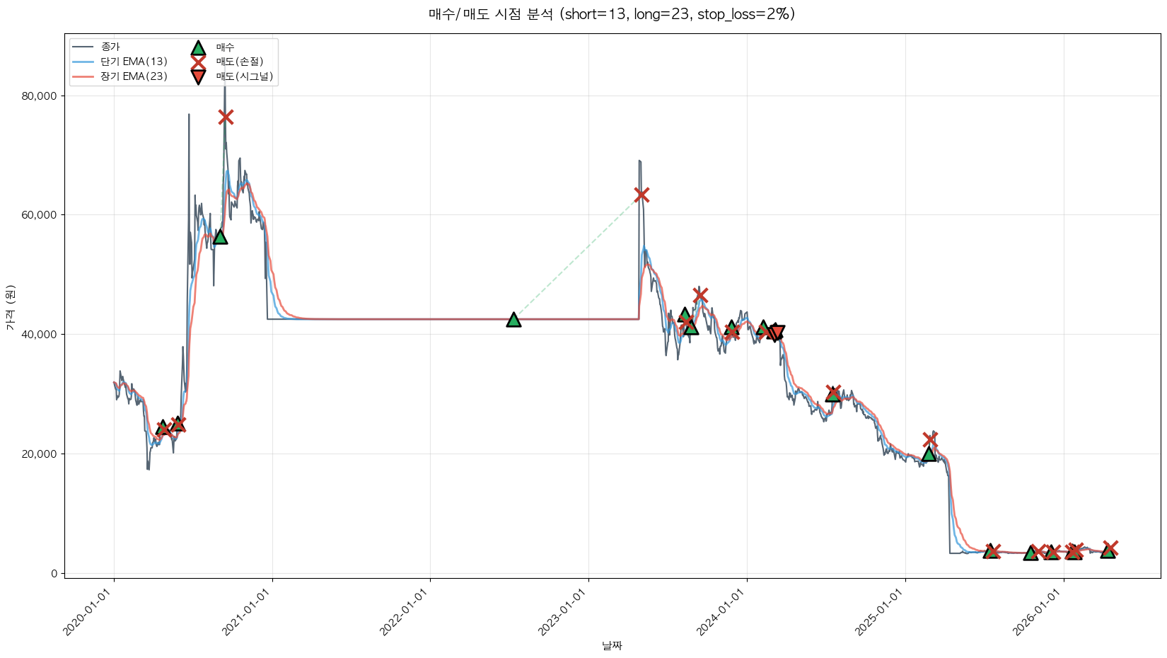 백테스팅 중... (short=13, long=23, stop_loss=2%)